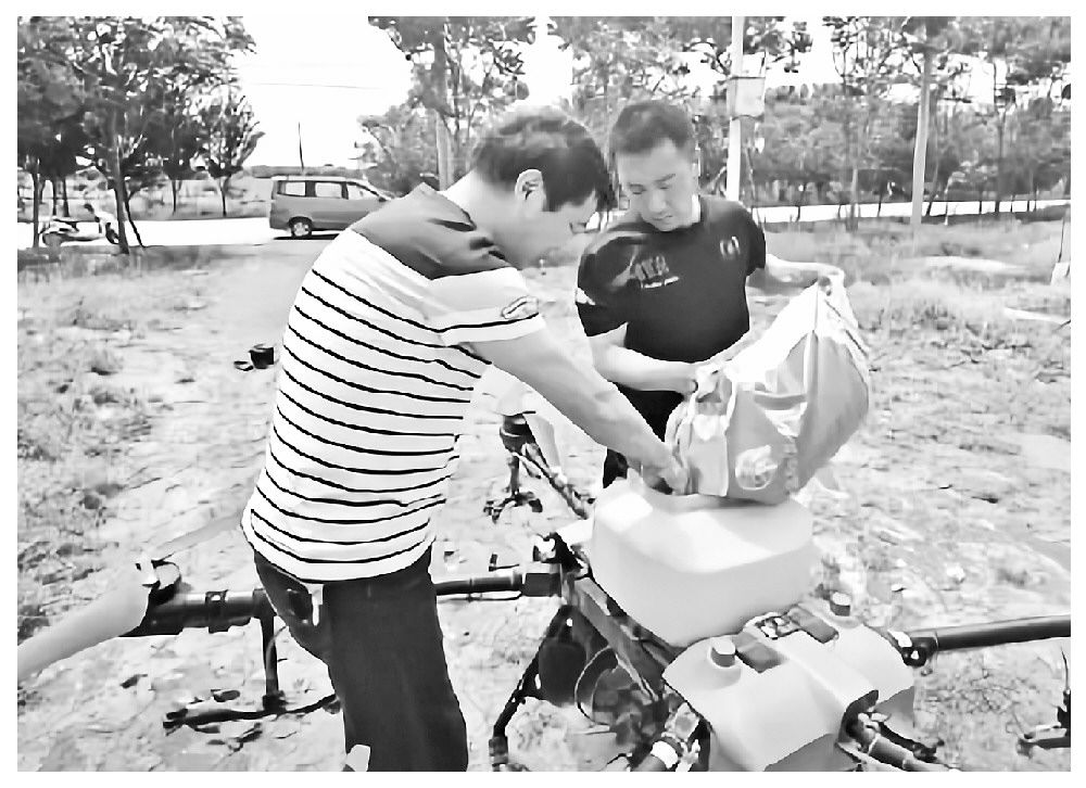 乔伟(右)和於叶兵(左)正在为无人机装饲料。