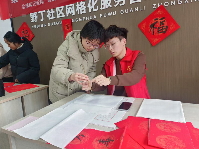 志愿者青年和小朋友一起伏案挥笔,寄情水墨,为当地居民写春联、送祝福。“金蛇狂舞春添彩,玉树临风喜满门”等一副副散发着淡淡墨香的春联,既是对过去一年的告别,也是对未来新一年的展望。
