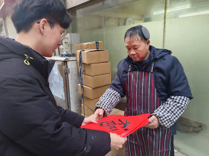 气候虽寒,但热情不减。志愿者和孩子们还一起为居民送去创作的福字、春联和花鸟画作品。当地居民拿着新鲜的春联仔细端详,止不住赞赏,夸赞同学们写得好,写得有活力。每一笔一墨中表达的尽是对新年的美好祝愿和期盼,写的是汉字,报的是节讯,暖的更是人心。在挥毫书写的过程中融汇悠久文化传承,感受传统书法魅力,树立坚定文化自信,沉浸欢度佳节氛围的同时也给社区居民送去了美好的祝福。