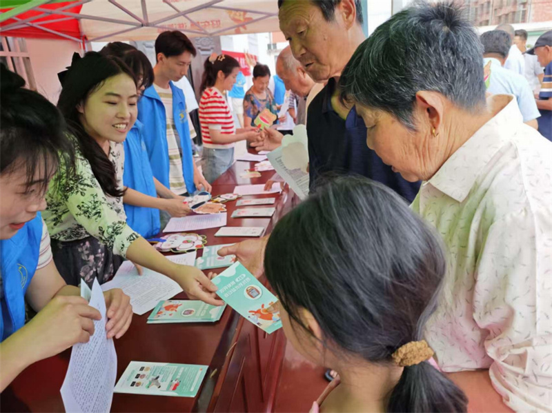 图为志愿者在吴滩社区给居民发放宣传手册。张凯供图