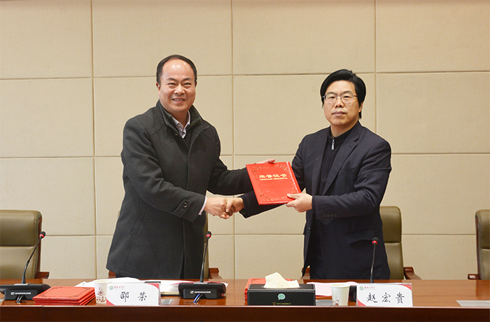 副校长邵荣向盐城市烟草专卖局(公司)局长、总经理赵宏贵颁发捐赠证书