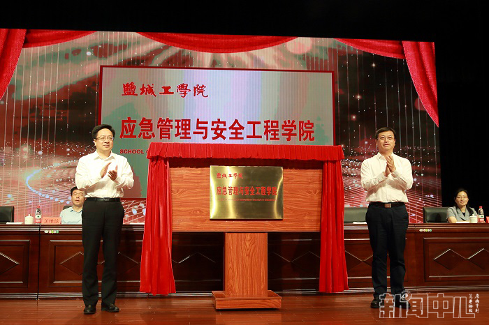 江苏省应急管理厅厅长陈忠伟和盐城市人民政府市长曹路宝共同为应急学院揭牌