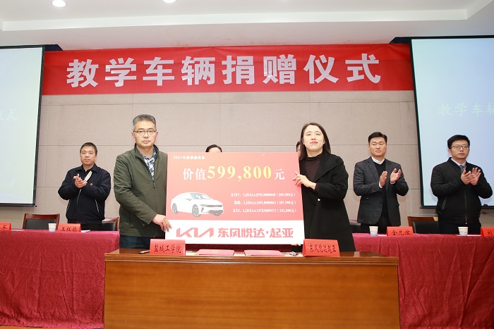 杨军与仓晓慧签订捐赠协议;熊新与金兑炫签订创新联盟协议并授牌。东风悦达起亚本次捐赠了包含K3 EV电动车、K5凯酷、KX5各一辆,价值599800元的教学车辆。