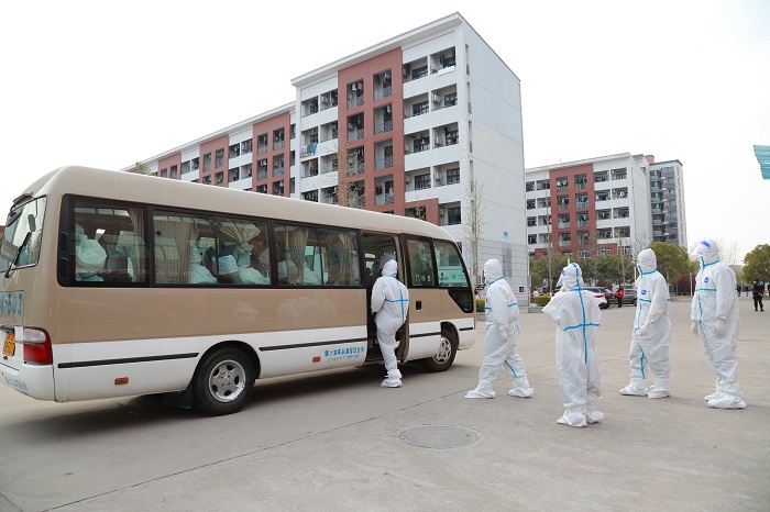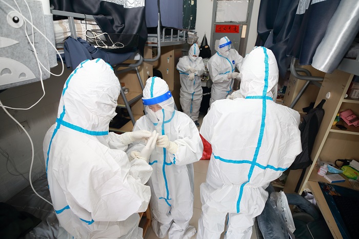 校医指导学生穿防护服