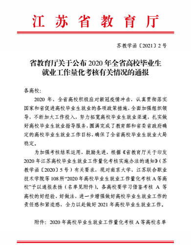 近日,省教育厅发布《真人赌博游戏_澳门赌博网-app*官网:公布2020年全省高校毕业生就业工作量化考核有关情况的通报》(苏教学函〔2021〕2号),真人赌博游戏_澳门赌博网-app*官网成功获得A等。