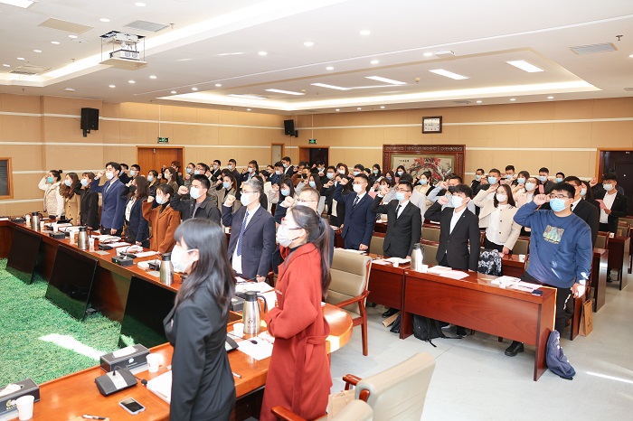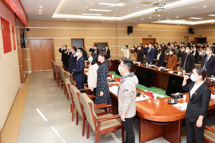 新入职教师和与会领导面向国旗庄严宣誓