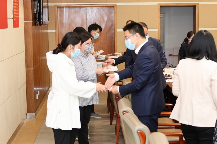校领导为新入职教师发放校徽、赠送书籍