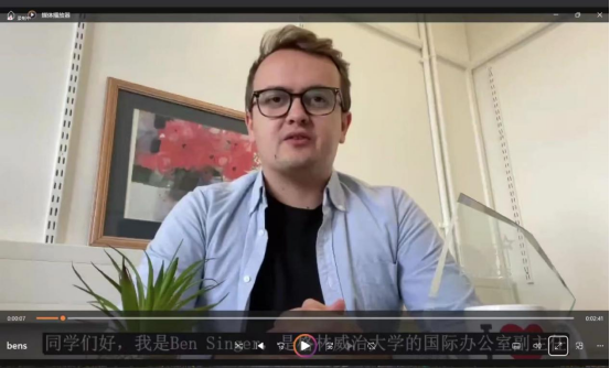 英国格林威治大学国际部副主任Ben Singer与美国底特律大学工学院机械专业系主任Nassif Rayess视频致辞。Ben Singer简要介绍了格林威治大学的地理优势、美丽的学习环境和浓厚的国际化氛围,并欢迎学生到格林威治大学学习,成就精彩人生。Nassif Rayess详细介绍了底特律大学机械专业的先进的教学理念、专业与企业行业紧密结合的课程特色。底特律大学十分注重培养学生的专业技能、实践能力、创造力、想象力以及企业家精神,他认为这些能力能让学生将来为企业和社会创造更大的价值,并为学生未来在自动驾驶、智能汽车等领域的发展奠定坚实的基础,欢迎世界各地大学生来底特律大学学习。