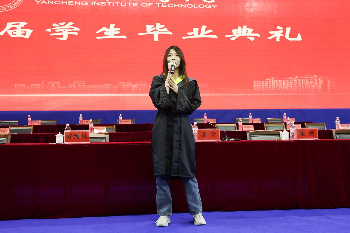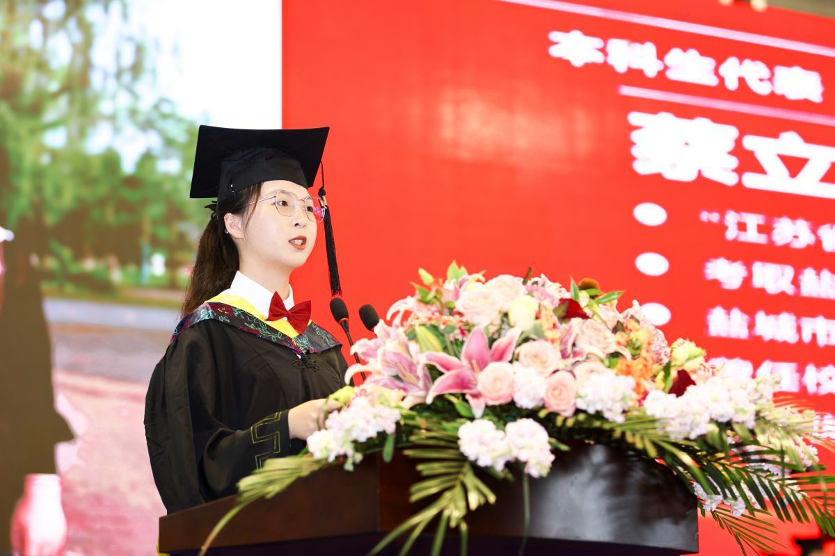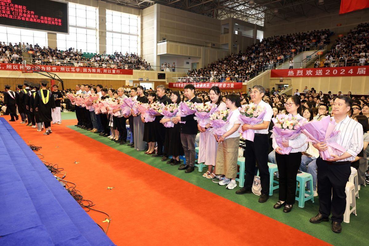 典礼上,毕业生代表向教职工代表敬献鲜花、鞠躬致谢,向他们几年来的辛苦付出和辛勤培育表达敬意。考取中国人民解放军陆军工程大学博士研究生、化学化工学院Y化工211班吴锋顺同学,考取盐城市选调生、江苏省“优秀学生干部”获得者、机械优集学院C机制201班蔡立雅同学,国家自然科学基金获得者、江苏省六大人才高峰高层次人才、信息工程学院院长王如刚教授,分别代表研究生毕业生、本科毕业生和教师发言。