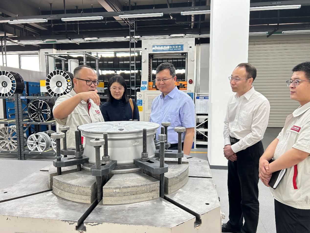 期间,崔刚一行参观了立中研究院、铝合金熔炼车间、轻量化零部件车间、精密车轮模具车间、铝合金车轮智慧生产线,体验了铝合金车轮生产全流程,了解了再生铝含量为70%的“绿色”铝合金车轮的开发历程,感受了立中车轮为低碳、绿色制造所作出的巨大努力。