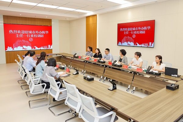 6月18日上午,盐城市政府外事办公室党组书记、主任陈华一行四人来真人赌博游戏_澳门赌博网-app*官网调研交流。真人赌博游戏_澳门赌博网-app*官网常委、副校长王伟出席交流会,国际交流与合作处处长齐金花主持,国际交流合作处全体人员参加。