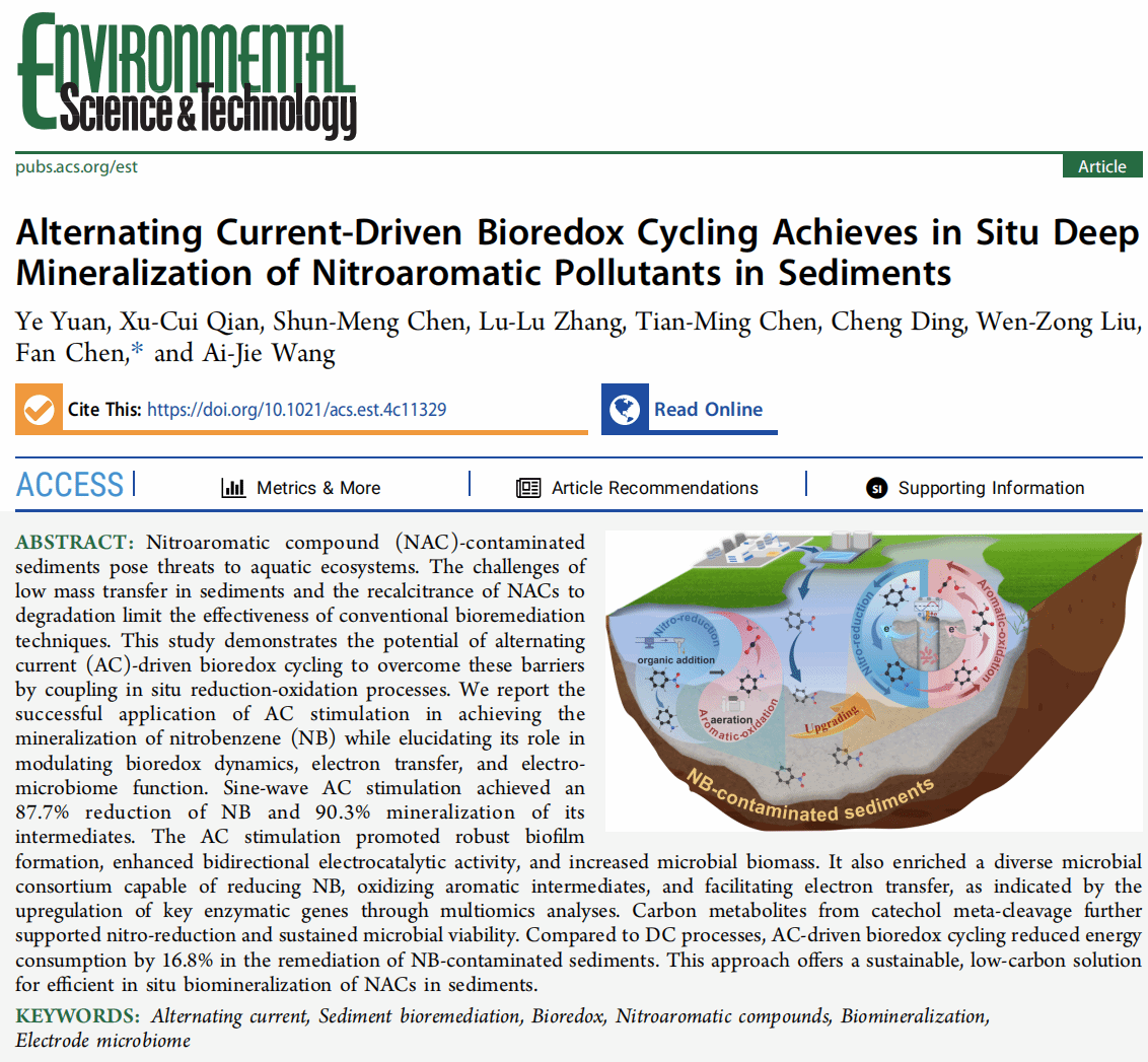 近日,真人赌博游戏_澳门赌博网-app*官网远野副教授课题组在国际环境领域的顶级期刊《Environmental Science & Technology》(ES&T)上发表题为“Alternating Current-Driven Bioredox Cycling Achieves in Situ Deep Mineralization of Nitroaromatic Pollutants in Sediments”的研究成果(Environ. Sci. Technol. 2025, 59, 14497–14507)。远野副教授为第一作者,校外兼职硕士生导师、西北工业大学陈帆副教授为通讯作者,2023级研究生钱徐翠为第二作者。这是真人赌博游戏_澳门赌博网-app*官网首次以第一单位在ES&T发表研究论文。ES&T创刊于1967年,由ACS出版,是国际环境领域最具影响力的顶级学术期刊之一,致力于报道环境科学与技术原创性、突破性的研究成果,以其卓越的学术质量和广泛的国际影响力而著称,2024-2025最新影响因子为11.3。