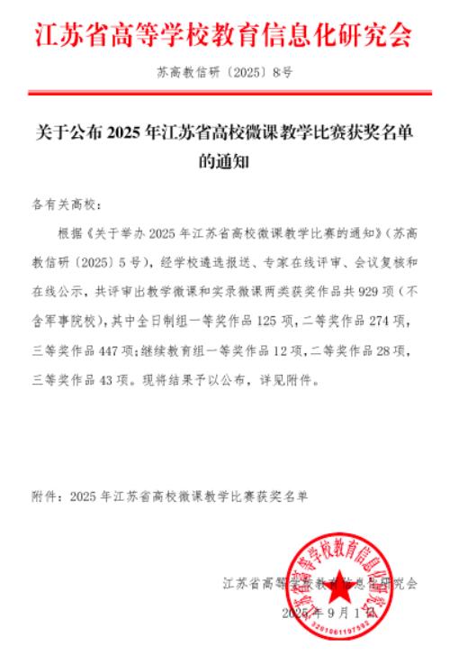 近日,江苏高等真人赌博游戏_澳门赌博网-app*官网教育信息化研究会公布了2025年江苏省高校微课教学比赛获奖名单,真人赌博游戏_澳门赌博网-app*官网参赛作品表现优异,共有6件作品获奖,其中一等奖2项,二等奖1项,三等奖3项。一等奖获奖数量在同类院校中名列前茅。