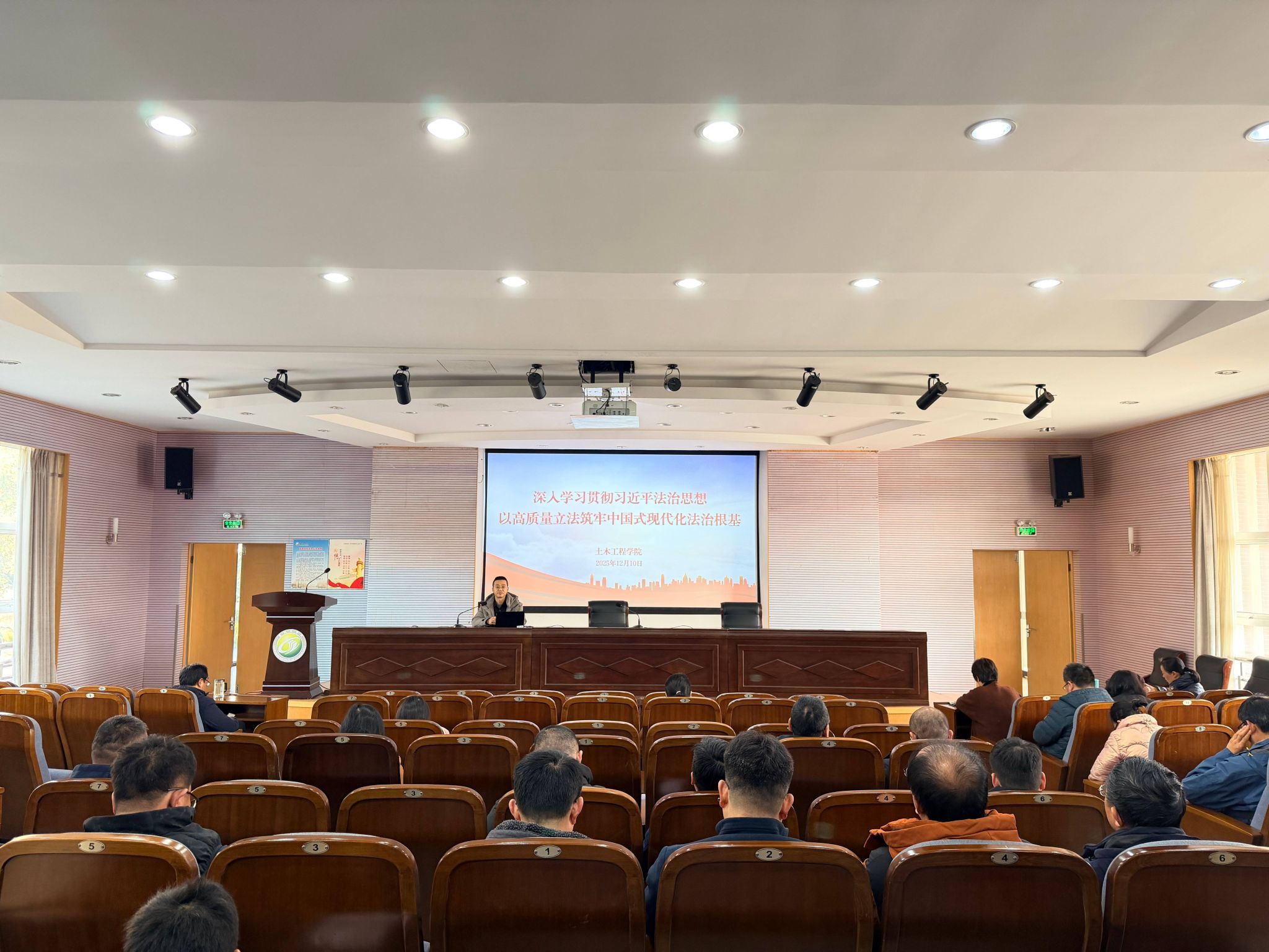 12月10日下午,土木工程学院在土木馆报告厅开展《深入学习贯彻习近平法治思想,以高质量立法筑牢中国式现代化法治根基》专题学习教育,学院党委副书记、纪检委员陈广正主讲,全体教职工参加。陈广正深入且透彻地剖析了习近平法治思想的核心要义与丰富内涵,并结合实际案例阐述了高质量立法对于中国式现代化的重要支撑作用。他强调,法治是国家治理体系和治理能力现代化的重要依托,而宪法作为我国的根本大法,是治国安邦的总章程。通过专题学习,大家对习近平法治思想有了更深刻的认识,进一步明确了宪法在国家法治建设中的重要地位,为后续更好地参与法治教育活动奠定了坚实的理论基础。
