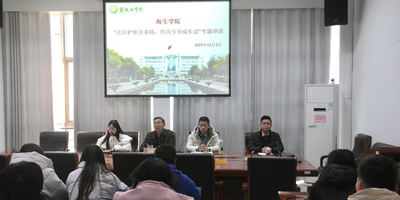 12月3日下午,海生学院在学院大会议室举办“法治护航青春路,班风引领成长途”专题培训。党总支书记高留才、党总支副书记孙新华、学工办主任郭海松、辅导员许璐出席,各班学生干部参加。与会老师结合青少年成长规律与校园治理实际,围绕法治素养培育与优良班风建设进行讲解。老师们解读校纪校规与法律常识,通过校园日常管理、学生交往相处等鲜活案例,深入浅出地阐明了班风建设需融入法治思维与规则意识,让规则意识融入日常言行。
