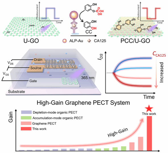 石墨烯光电化学晶体管(Graphene Photoelectrochemical Transistor, GPECT)作为一项新兴技术,融合了光电化学生物传感的高信噪比、高灵敏度特性,以及晶体管本征的信号放大能力,能够实现光-电-生物识别事件的相互关联。基于前期研究工作基础(Advanced Functional Materials 2025, 35: 2500235;Chinese Chemical Letters 2025, 36: 110080;Biosensors and Bioelectronics 2025, 268: 116877;Journal of Analysis and Testing JAT-2025-0647 accepted on Nov 14, 2025),王成双和王伟教授联合南京大学赵伟伟教授设计并开发了一种同时实现信号翻转和超高增益的GPECT生物传感平台,具体而言,主要利用聚邻苯二酚/紫外还原氧化石墨烯(PCC/U-GO)光敏栅极对GPECT器件进行高效调控,并应用于糖类抗原125(CA125)的高灵敏检测,通过采用标记碱性磷酸酶的夹心免疫法,催化生成邻苯二酚(CC)在U-GO栅极表面原位聚合形成PCC,沟道电流呈现阳极到阴极的信号翻转,器件实现了高达1.7 × 10?的超高增益,同时对生物标志物CA125的检测限低至0.004 mU mL?1。该工作将有力推动新型栅极材料在生物电子学和光电子学领域的广泛研究与应用。