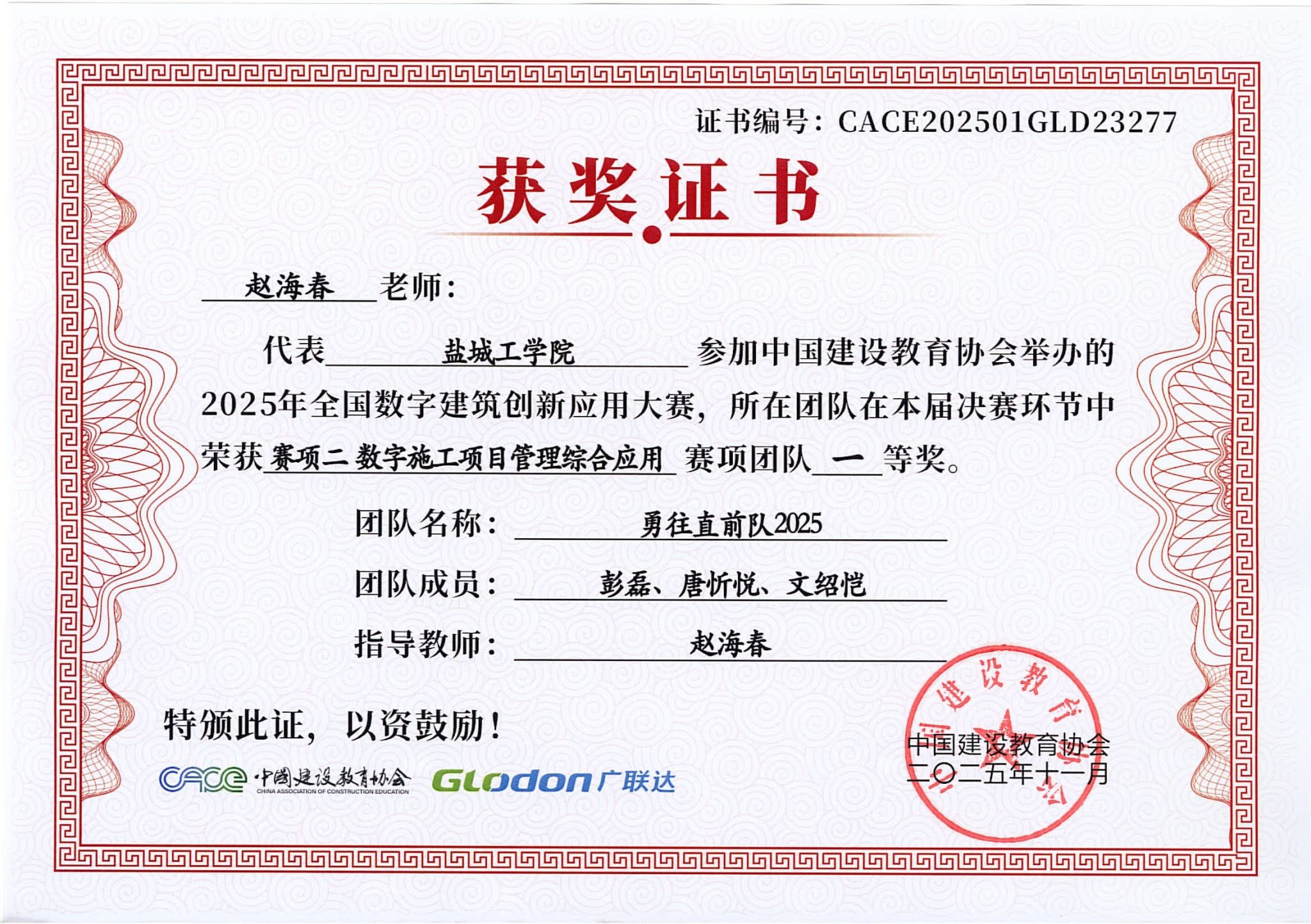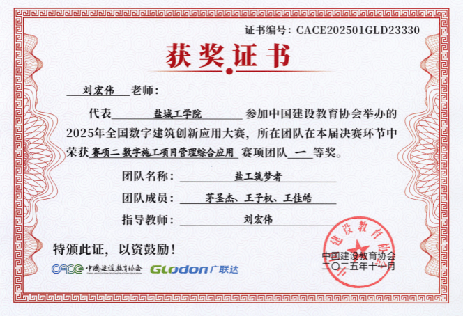 1 | 彭磊、文绍恺、唐忻悦 | 工程管理 | 赛项2:数字施工项目管理综合应用 | 全国一等奖 |