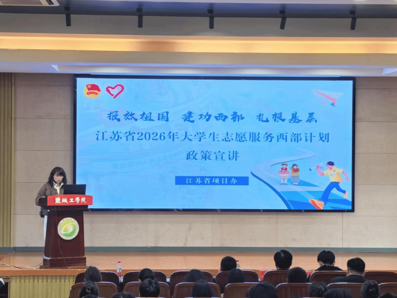 为深入推进大学生志愿服务工作,引导广大青年学子扎根基层、奉献青春,积极投身祖国建设与乡村发展事业,3月26日下午,“青春志愿行 奉献新时代”2026年江苏省大学生志愿服务“两个计划”高校巡回宣讲会在机械馆报告厅举行。团省委社会联络部(志愿者工作部)副部长、三级调研员孙显泉,江苏省项目办工作人员刘君杰,校团委副书记胥爱国、各二级学院分团委书记及毕业班学生代表近300人出席会议,校团委社团管理部主任陆苏华主持会议。