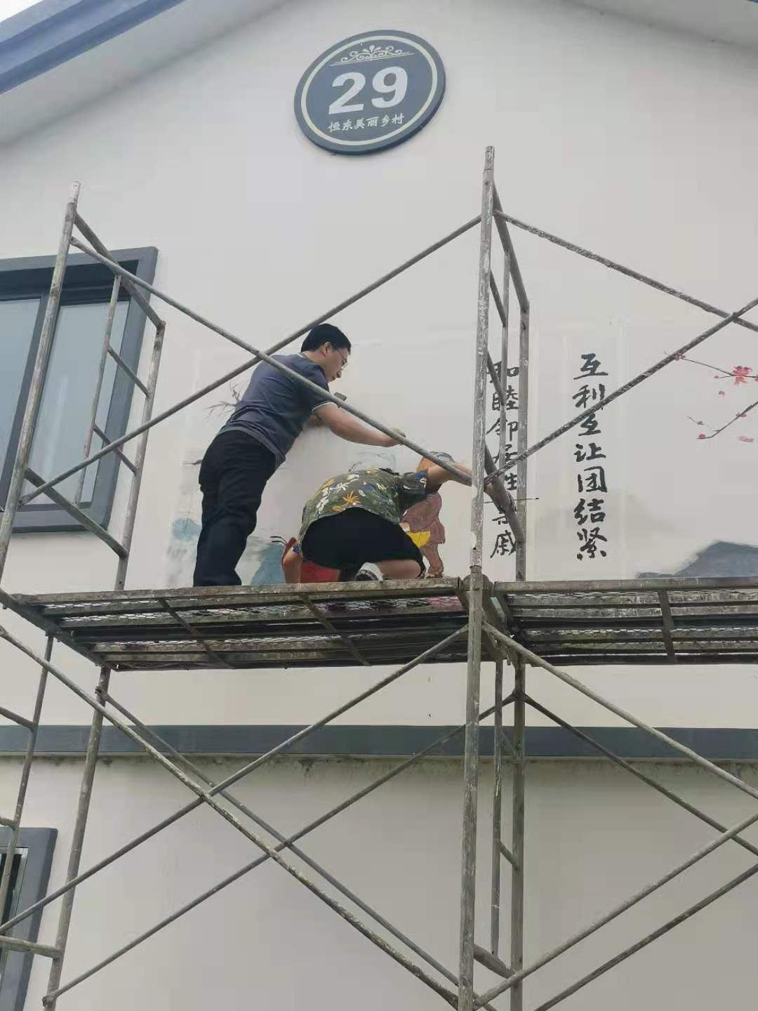 前期,设计艺术学院的师生们多次走访恒东村进行现场测绘,对村里的八户人家进行庭院改造。师生返校后进行设计,确定草图,最终形成了庭院改造方案和整体墙绘方案。设计艺术学院部分教工党员和学生到恒东村开展墙面彩绘。经过一个下午的辛勤工作,完成所有墙绘工作,村容村貌有了较大的改变。