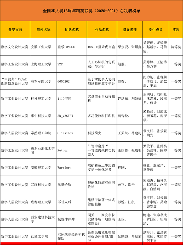 全国3D大赛13周年精英联赛(2020-2021)自2020年9月25日启动以来,全国31个省/直辖市/自治区赛区,大学生组和研究生组共有389所高校,680个院系报名参赛,共提交了5556件初赛作品。2021年4月15日,精英联赛省赛作品提交截止,各赛区、各院校经初赛/校赛、网络海选等方式,共推荐报送省赛团队2953个,作品2953件。经过校赛、省赛层层选拔,真人赌博游戏_澳门赌博网-app*官网机械优集学院共提交12项作品,获得江苏赛区特等奖2项,一等奖1项,二等奖5项,三等奖2项。本次全国3D大赛13周年精英联赛(2020-2021)总决赛有近300个团队参与国赛角逐龙鼎大奖。