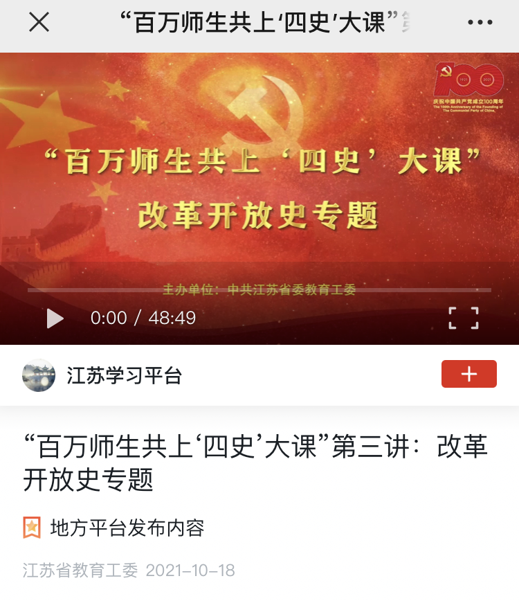 11月10日下午,在南校区润美楼A209,设计艺术学院教工党支部组织开展党史学习教育专题活动,集中收看学习“百万师生共上四史大课”第三讲“改革开放史专题”,苏州大学马克思主义学院王慧莹、吉启卫、田芝健三位老师分别从改革开放的光辉历程、改革开放的伟大成就、改革开放的宝贵经验三个方面展开详细论述。学院党总支书记胡凌霞主持,支部全体党员参加活动。