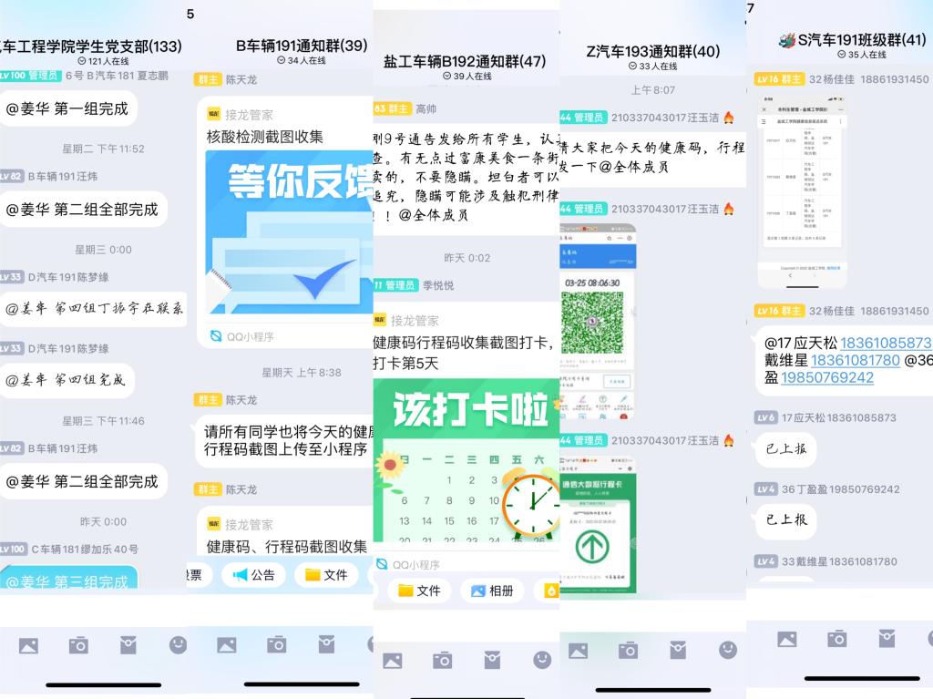 各班学生党员每日督促班级同学完成健康日报,主动核查班级每日接龙情况,筛查是否有少报、漏报、瞒报情况,在师生党员的共同努力下,学院做到每日“零报告”;学生党员承担各自班级苏康码、行程码、核酸检测结果的收集和核查工作,提醒同学出门戴好口罩,真正担当起班级防疫工作的直接责任。