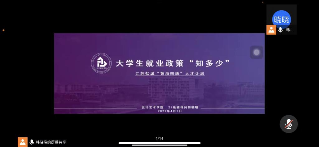 为应对当前就业形势,扎实做好就业工作,加强对学生就业的指导与帮助,4月1日下午,设计艺术学院举行线上就业宣讲会。学院韩晓晓老师为大三、大四年级学生就盐城相关就业政策、人才需求情况进行讲解。