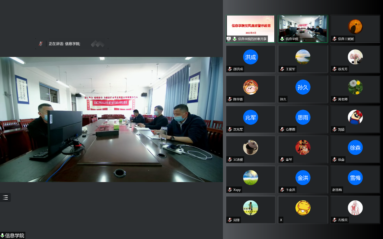 5月2日,信息学院在希望大道校区怀德楼B410会议室开展党风廉政警示教育,学院领导班子成员及各科室、专业系、实验中心主任参加学习教育,活动采取线上和线上相结合的方式。会议由学院党委书记王爱军主持。