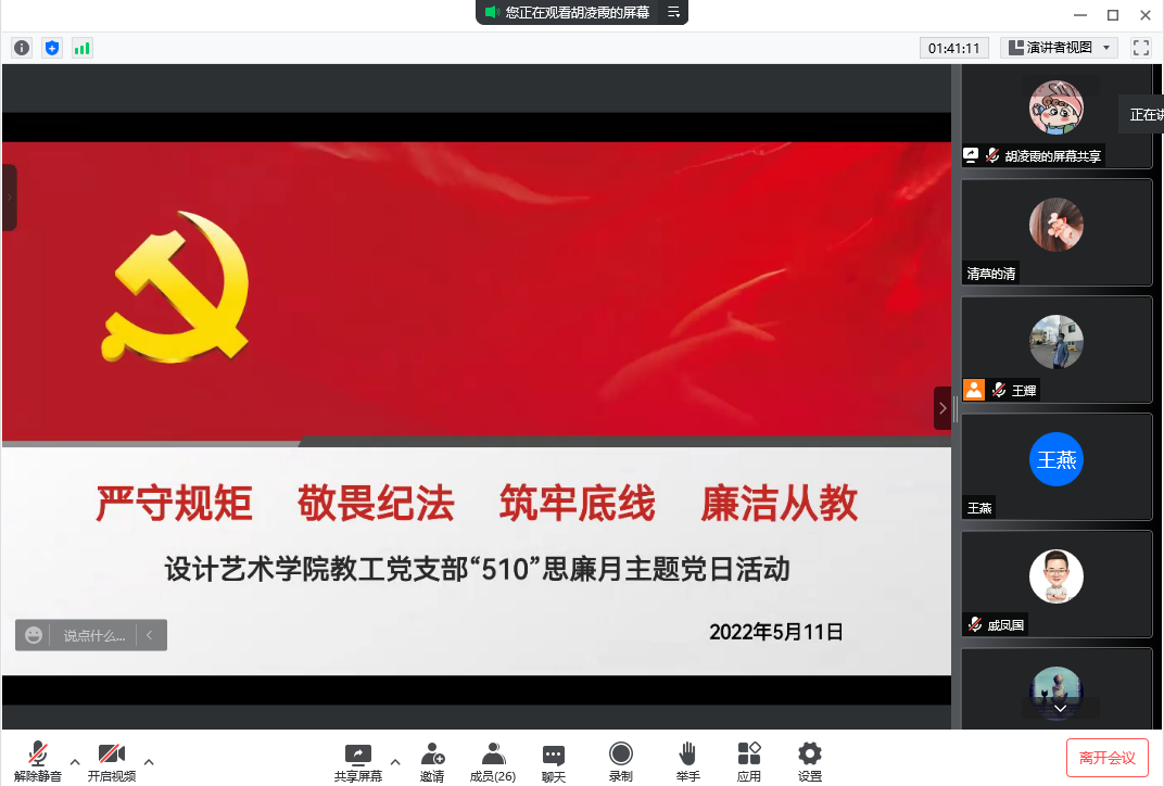 5月11日下午,设计艺术学院开展“510”思廉月学习教育活动。学院党总支书记胡凌霞作题为《严守规矩 敬畏纪法 筑牢底线 廉洁从教》的专题党课,全体教职工线上参加。