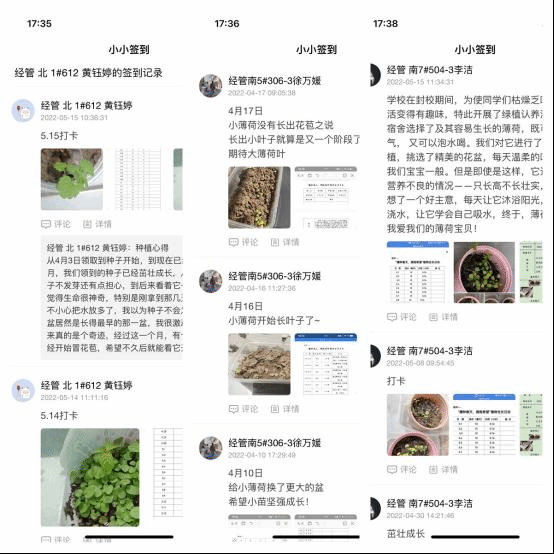 本次“绿植领养”活动实现线上线下紧密融合互动,学生参与热情高涨、反响热烈。活动开始,受疫情影响,种植条件有限,同学们自己带着小铲子在真人赌博游戏_澳门赌博网-app*官网的花坛边、松树下挖土,用吃过的外卖盒和剪断的饮料瓶底做花盆。怀着忐忑而又虔诚的心情种下种子,浇水、晒太阳、拍照、记录打卡几乎成了同学们每天的“必修课”。交流群里常常是这一方请教取经,虚心学习,那一方交流共享,共同提高,互帮互助的友爱氛围蔚然成风。