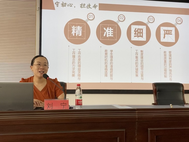 刘宁作“不忘初心为红烛,牢记使命育栋梁”专题讲座。作为自2005以来一直从事一线工作的辅导员,她从中华古籍中追本溯源,从实际工作中传递感悟,生动而深刻地阐述了“何为初心、使命?”“如何守初心、担使命?”。她指出,“精、准、细、严”是工作法则,更是育人良方,由此分享了个人工作实践、工作思路和育人感悟,以及参加各类高层次辅导员素质能力提升平台的尝试、挑战和获得。她希望年轻辅导员怀揣红心、雄心、匠心、真心、热心、自信心的“六心”,要勇于担当,砥砺强烈的责任意识;要能够担当,锤炼担当重任的能力;要敢于担当,提升负责担当的底气。