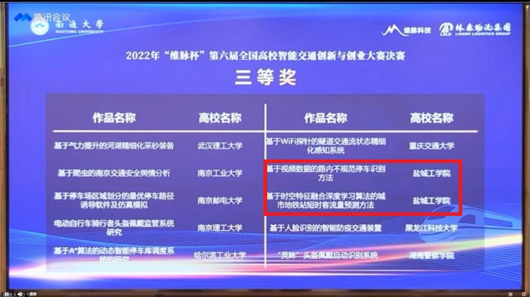 7月3日,“维脉杯”第六届全国高校智能交通创新与创业大赛决赛在南通大学落下帷幕,本次比赛采用线上方式进行。经过线上演讲、实物展示、评委提问等环节,材料学院学生2项作品获三等奖,分别是交通工程专业胡莹莹、杨锦诚、宋亚静、李丽莎、刘浩宇五位同学完成的作品《基于时空特征融合深度学习算法的城市地铁站短时客流量预测方法》(指导老师:钟栋青、韦凌翔)和胡化鹏、姬玉川、徐晶楠、陈天昊、刘义伟五位同学完成的作品《基于视频数据的路内不规范停车识别方法》(指导老师:韦凌翔、钟栋青)。