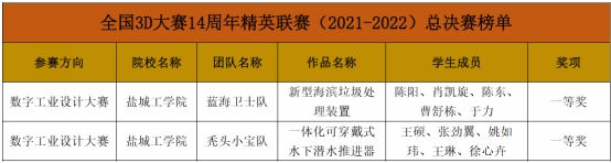 近日,全国3D大赛14周年精英联赛(2021-2022)总决赛榜单公布,真人赌博游戏_澳门赌博网-app*官网机械优集学院侯鹏亮、郁倩等老师指导的《新型海滨垃圾处理装置》《一体化可穿戴式水下推进器》获得全国一等奖。