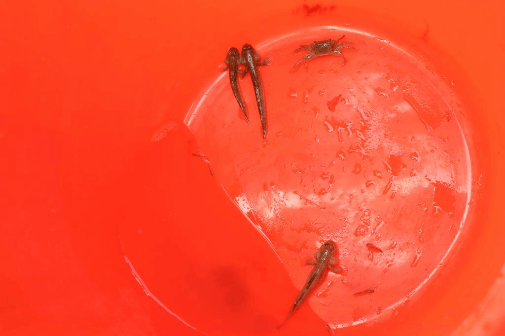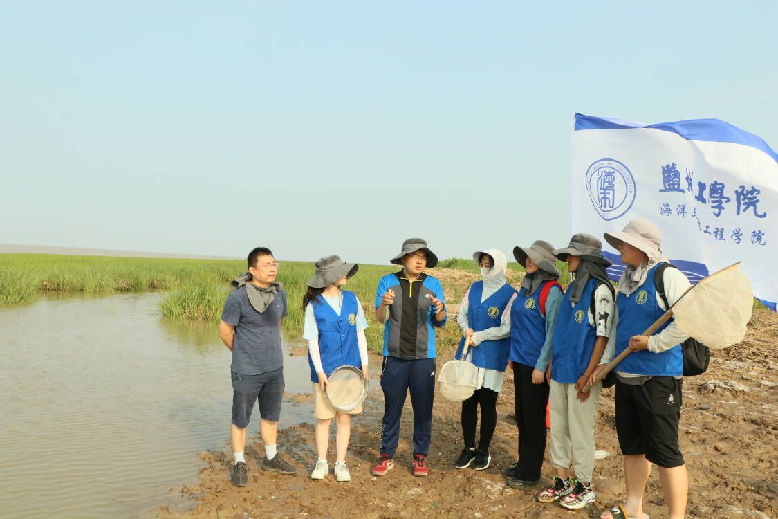 一到黄沙港,大家就全副武装了起来,撸起裤脚,带上防晒帽,拿起捕捞工具,走进了滩涂。隋老师向同学们介绍了滩涂的形成以及它的生态环境,并介绍了基本的捕捞方式。他提到盐城海岸线上有上千种的海洋底栖生物,如我们常见的螃蟹、沙蚕、海螺、鰕虎鱼等。在了解一些知识后,一行人带上自己的装备就向大海进军,B海洋202的瞿彬彬抄网就抓起了“跳跳鱼”。“跳跳鱼”学名又叫弹涂鱼,是虾虎鱼科、弹涂鱼属的一种鱼类。常依靠发达的胸肌柄匍匐或跳跃于滩涂上,退潮时在滩涂上觅食。其移动速度特别快,在海滩上犹如一个弹跳运动员,刚想动手去抓,它就已经跳远了。瞿彬彬来回挥网只捞起来一些水草,满头大汗却毫无收获。B生物202的韦轩见状过来帮忙,“彬彬,你在前面抓,我在后面堵。” “当你看见跳跳鱼的时候,你就已经抓不到它了。”齐志涛在一旁笑道。在老师的点拨下,同学们开始了一顿疯狂的“盲捕”操作,不看位置疯狂捕捞。第一轮捕捞过后,渔网里出现了两条“跳跳鱼”!“跳跳鱼”也被这种没有套路的捕捞法“弄昏了头”,乖乖束手就擒了。