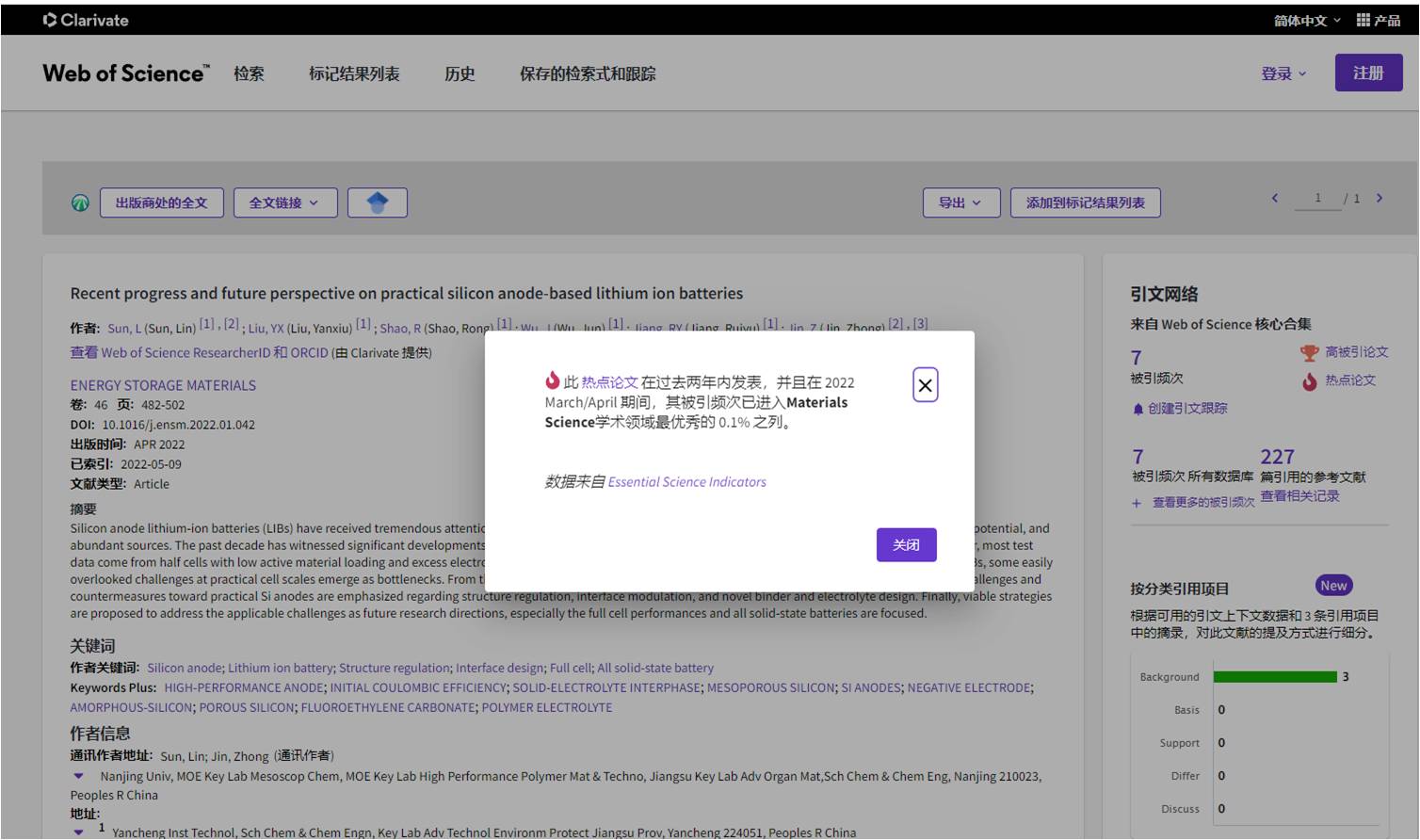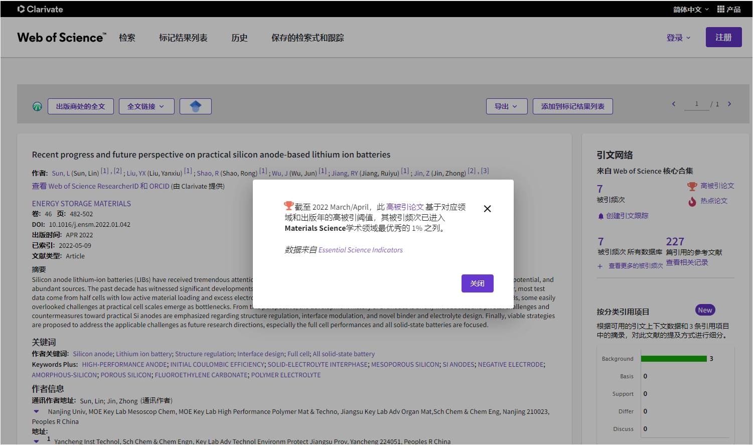 近期,根据Essential Science Indicators (ESI)数据库检索结果显示,省新型环保重点实验室孙林博士为第一作者,真人赌博游戏_澳门赌博网-app*官网为第一单位综述论文《Recent Progress and Future Perspective on Practical Silicon Anode-Based Lithium Ion Batteries》(Energy Storage Mater., 2022,46, 482-502,影响因子20.831),在对应领域和出版年中的引用的次数已归入其学术领域中最优秀的1%和0.1%之列,被收录为ESI材料学科“高被引论文”(Highly Cited Papers)和“热点论文(Hot Papers)”。该成果是在江苏省新型环保重点实验室和江苏省生态建材与环保装备协同创新中心支持下,研究团队成员共同努力取得的。