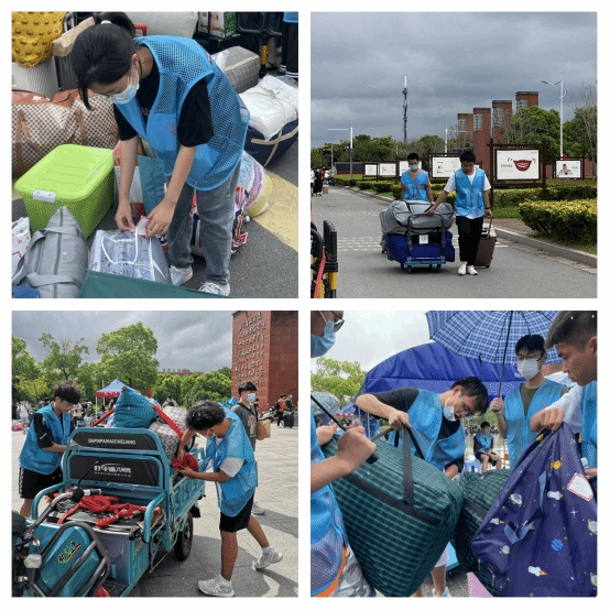 校门口,志愿者们高高举起迎新指示牌,主动帮助新生搬运行李,耐心回答家长们的问题,他们用真诚和热情打消了家长们的顾虑。校内接待处,新生出示录取通知书、提供苏康码、核酸证明、报到登记,整个环节周密严谨,井然有序。尽管雨一直下,但志愿者们丝毫没有停歇,他们用推车或直接提起新生的行李,与时间赛跑,一趟又一趟地帮助新生运往宿舍,不让行李淋湿。