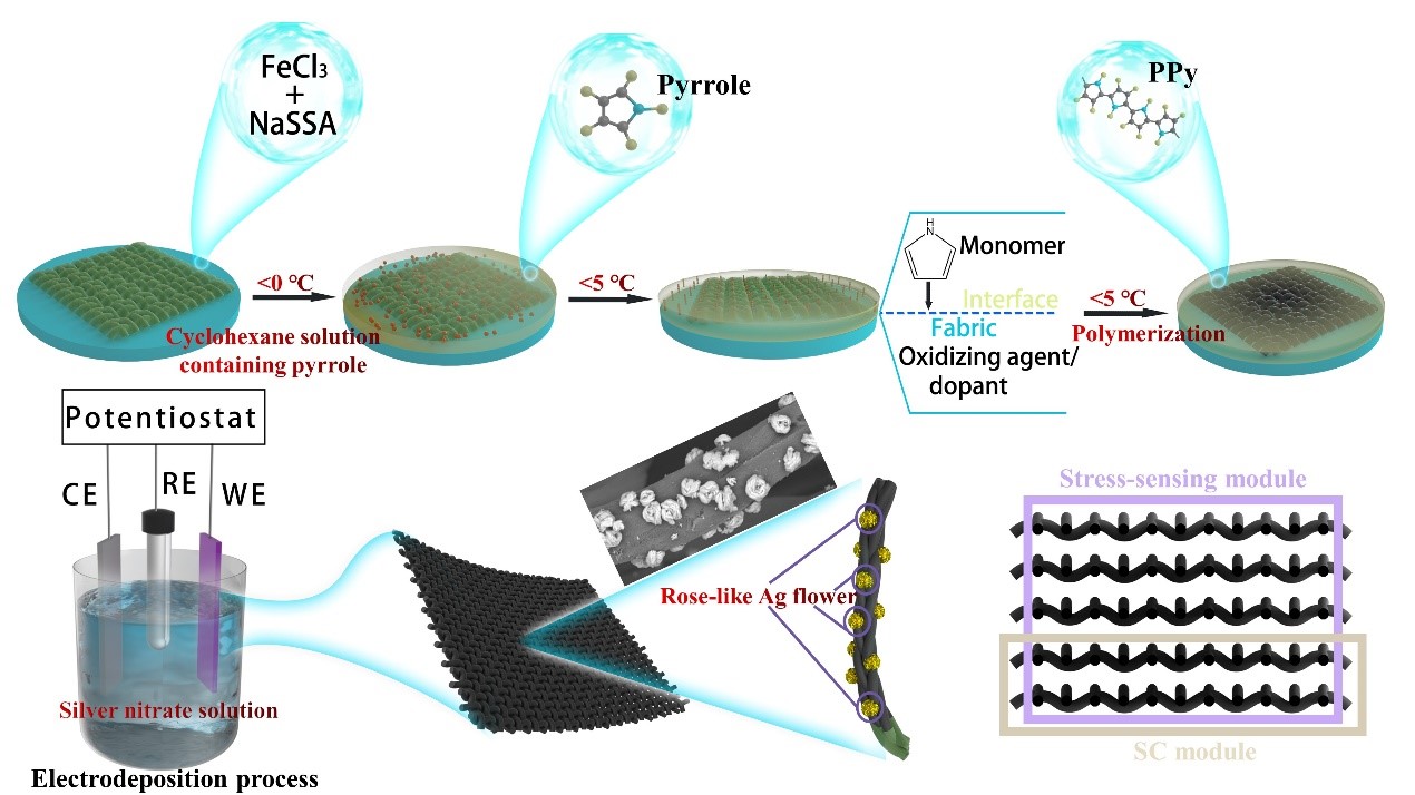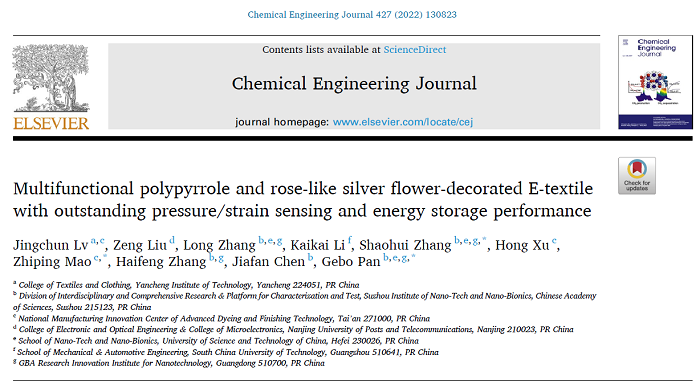 2022年,真人赌博游戏_澳门赌博网-app*官网纺服学院教师吕景春博士(第一作者)与苏州纳米技术与纳米仿生研究所张少辉博士(通讯作者)合作,在化工领域顶级学术期刊《Chemical Engineering Journal》(TOP,IF=16.744)上发表题为“Multifunctional polypyrrole and rose-like silver flower-decorated E-textile with outstanding pressure/strain sensing and energy storage performance”的研究论文。