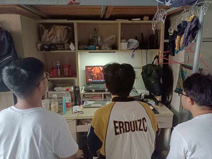 活动中,与会师生一起观看天安门广场国庆升国旗仪式,学院其他同学在宿舍同步观看。