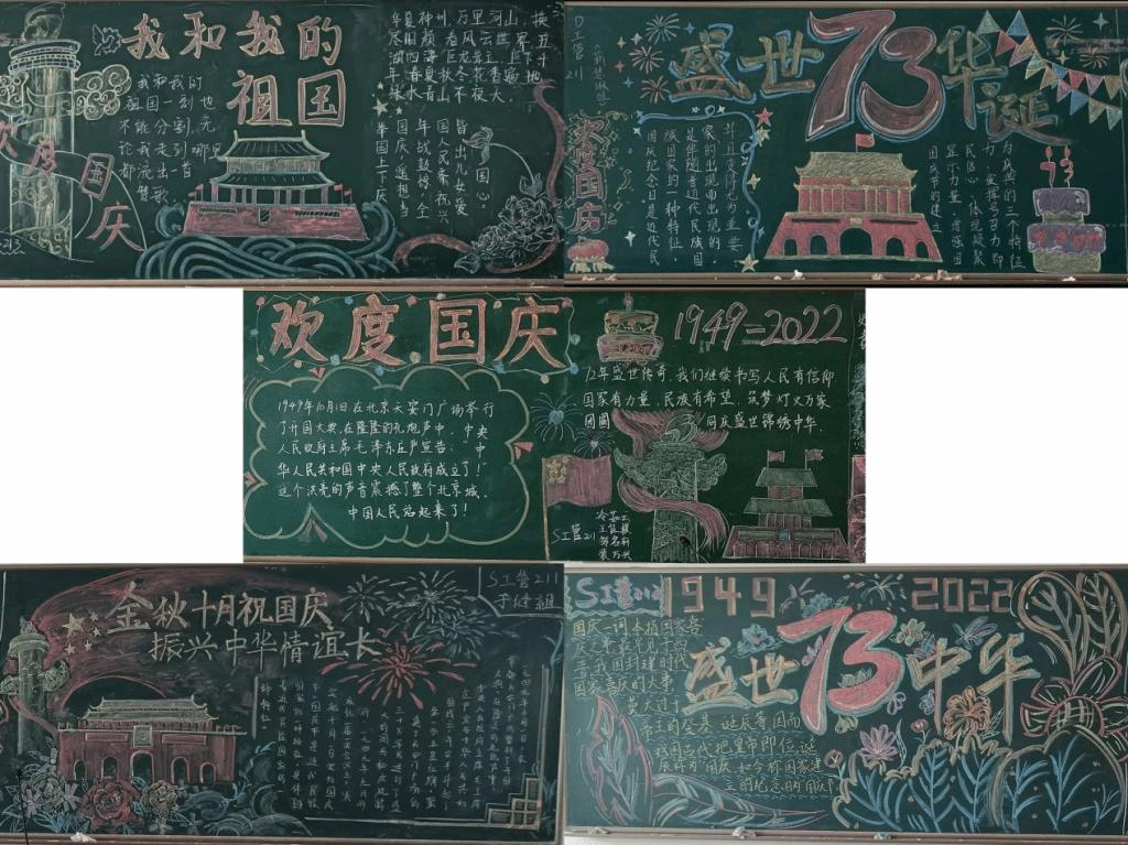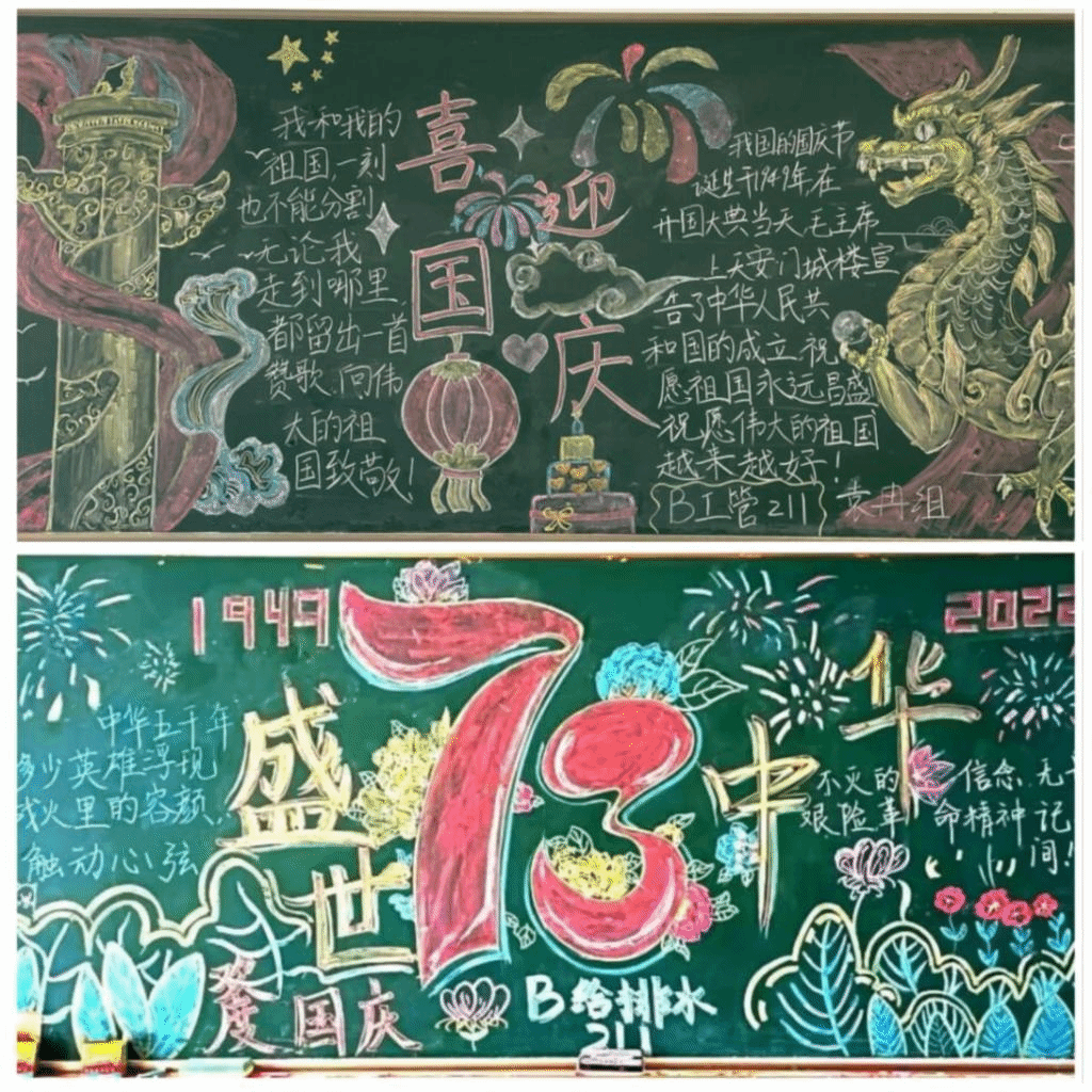为庆祝中华人民共和国成立73周年,加强对学生的爱国主义教育,增强学生民族意识,丰富业余文化生活。学院举办了“迎国庆 颂祖国”主题黑板报活动。此次比赛共21组同学参赛,黑板报设计主题鲜明,内容充实,构思新颖,画面美观,书写规范,充分展现了土木学子积极向上的精神风貌,营造了浓郁的校园文化氛围。评委们本着客观、公正、公平的原则,对各组板报的报头、板面设计、栏目内容、书写、整体效果等方面进行逐项打分,评选出B建筑211(史静娴团队)获得一等奖,B给排水211(马可鸿团队)、B工管211(袁冉团队)获得二等奖;S工管211(于健团队)、D工管211(靳慧琳团队)、S工管212(赵瑾团队)、S工管211(冷茹云团队)、B土木213(施慧团队)获得三等奖。