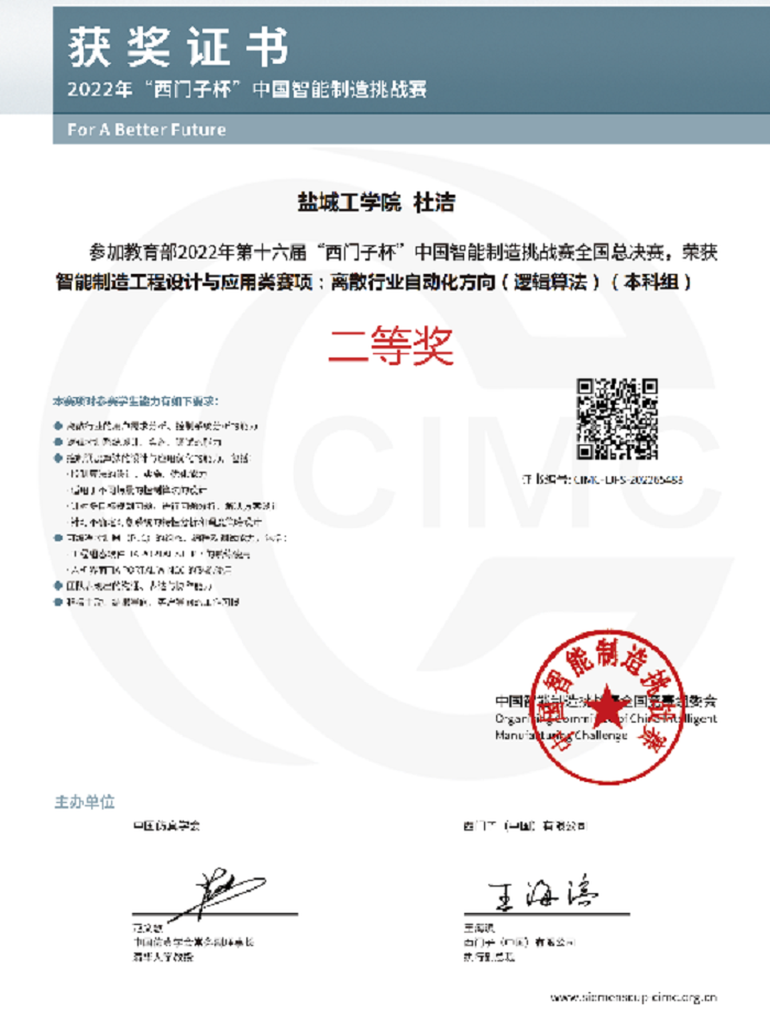 9月29日,第十六届“西门子杯”中国智能制造挑战赛全国总决赛闭幕式落下帷幕。真人赌博游戏_澳门赌博网-app*官网电气工程学院杨晓冬、段文勇老师指导,张慕贤、王余鹏、杜洁同学组成的“盐工三小只”团队获得离散行业自动化(逻辑算法)方向的全国总决赛二等奖。