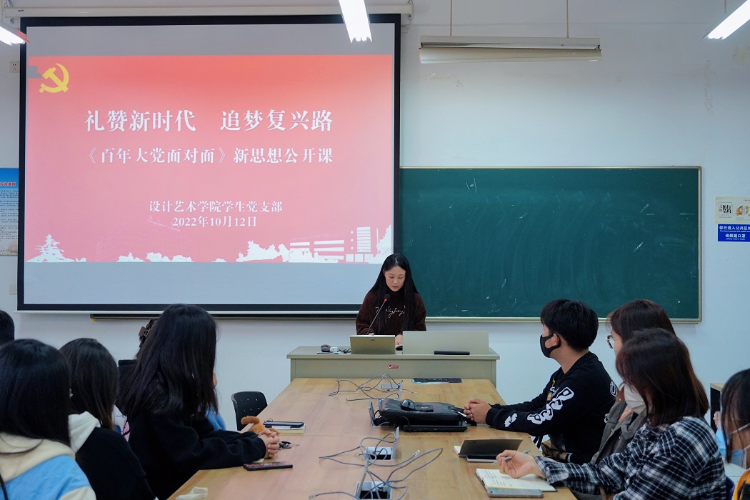 10月12日下午,设计艺术学院学生党支部在润美楼A209开展“礼赞新时代 追梦复兴路”——《百年大党面对面》新思想公开课,会议由党支部书记顾清主持,党支部组织委员叶禎菲领学,全体学生党员参加。