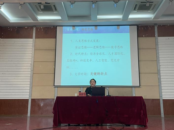 徐新华以《在守正创新实践中发展自我》为主题,介绍思维方式发展、当今时代特点、关键转折时期、培养学习能力、学会科学管理等方面内容,讲解“荷花定律”“竹子定律”和“一万小时定律”,通过事例分析引导同学们打好基础,厚积薄发。她指出,当代青年大学生是与新时代同向同行、共同发展的一代,生逢盛世应当倍感珍惜,同学们要学会学习,科学规划人生目标,努力提升学习能力、实践能力、创新能力,在实践中发展自我。她还向同学们推荐三本阅读书:《共产党宣言》《习近平谈治国理政》《从0到1》,寄语同学们“提升解决问题的能力,赋能未来,成就最好的未来!”