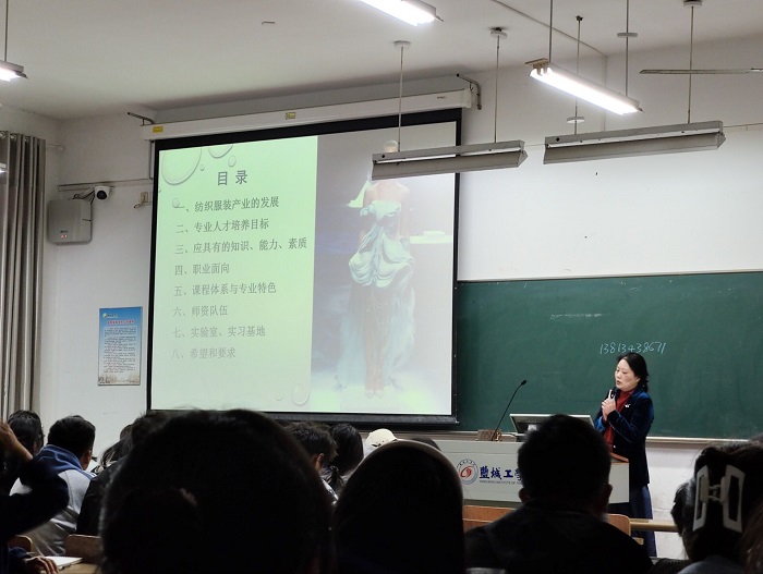 王春霞首先对自己的工作学习经历进行了介绍,以自己的亲身经历鼓励同学们奋发图强,永远不要停下前进的脚步,要努力去成就更好的自己。接着她向同学们介绍了盐城这座城市,讲述了盐城的发展前景和黄海明珠人才计划等,强调了盐城对人才的优厚待遇,希望同学们可以爱上这座城市。随后,她从纺织工程专业的发展历史、研究方向、服务产业、产业发展前景以及业内重要人物等几方面进行了重点介绍,进而让同学们能够更加全面地了解纺织工作专业。最后王春霞希望同学们能够尽快适应大学生活,做好职业生涯规划,强身健体、勤奋学习,为美好的人生而奋斗。