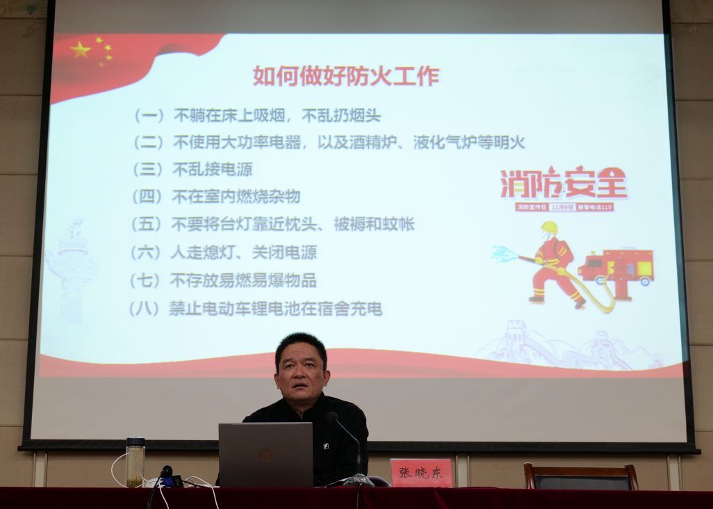 在安全主题报告中,张晓东从安全的概念入手,强调国家安全是安邦定国的基石,要求大学生能正确理解和把握总体国家安全观。他以全国各地安全事故的频繁发生作为引入,针对财产、人身、消防、交通、食品、旅游等方面进行安全教育,提醒同学们在防盗、防骗等方面应加强安全知识的学习,向学生普及了“16个安全”,重点介绍了校园消防安全知识,要求同学遵守校园规定。