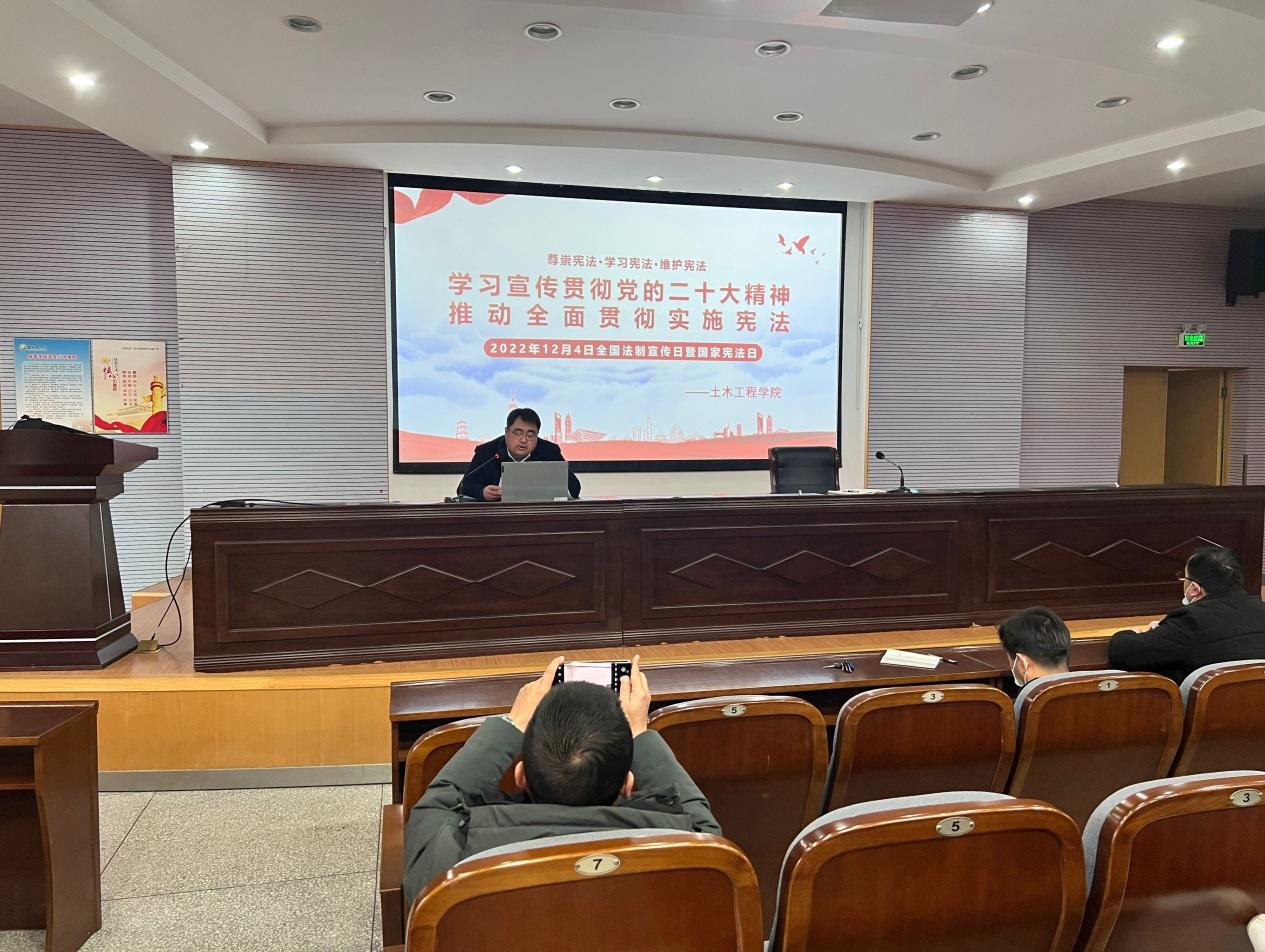 11月30日下午,土木工程学院在土木馆报告厅开展以“学习宣传贯彻党的二十大精神,推动全面贯彻实施宪法”为主题的专题宣讲活动。会议由学院党委书记谷伟主持并宣讲,土木学院全体教职工及部分学生代表参加。