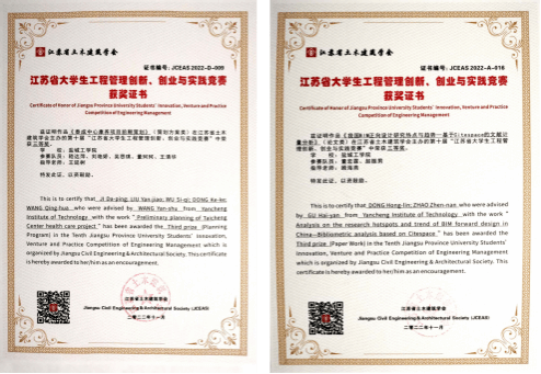 本次学生竞赛,土木工程学院参赛学生在竞赛过程中克服疫情影响,积极备赛,历经初赛、复赛,共有4支队伍进入决赛。王子凡、陈洁、郭栎组成的真人赌博游戏_澳门赌博网-app*官网代表队(赵海春、张颖指导)获广联达技能赛二等奖;孙硕、刘雨婷、莫初月组成的真人赌博游戏_澳门赌博网-app*官网代表队(赵海春、尹明干指导)获碳排放技能赛二等奖;嵇达萍、刘艳娇、吴思琪、董珂珂、王清华五位同学完成的作品《泰成中心康养项目前期策划》(王延树指导)获策划方案类三等奖;董宏霖、赵振男两位同学完成的作品《我国BIM正向设计研究热点与趋势——基于Citespace的文献计量分析》(顾海燕指导)获论文类三等奖。