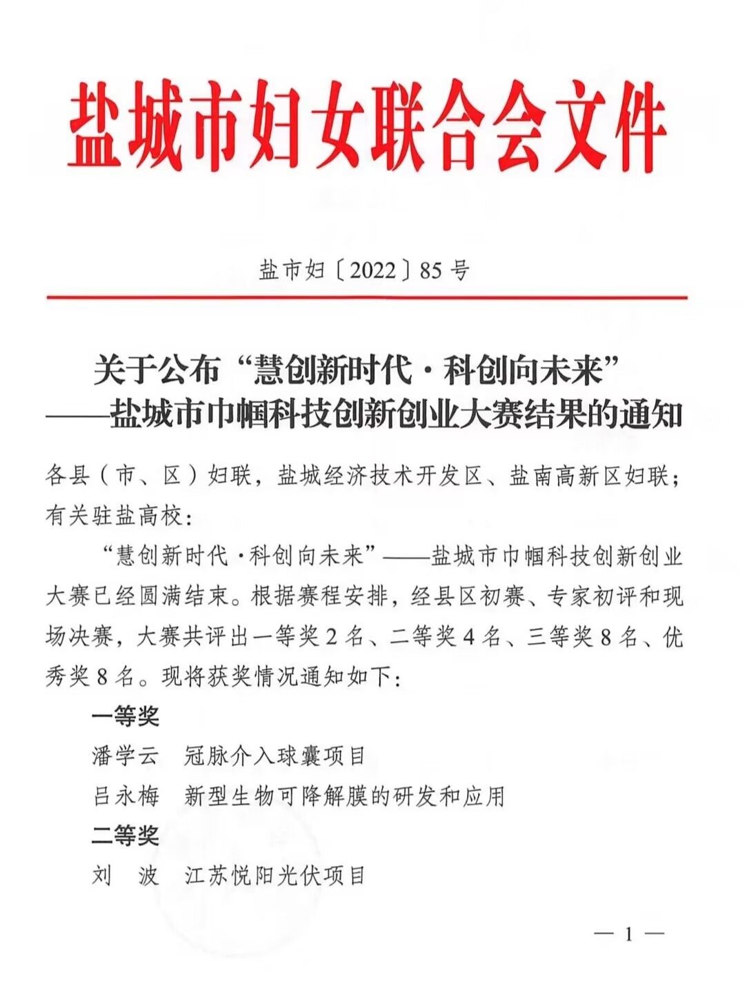 日前,盐城市妇联公布了“慧创新时代?科创向未来”——盐城市巾帼科技创新创业大赛结果(盐市妇(2022)85号文),真人赌博游戏_澳门赌博网-app*官网海洋与生物工程学院吕永梅老师的《新型生物可降解膜的研发和应用》项目荣获一等奖。