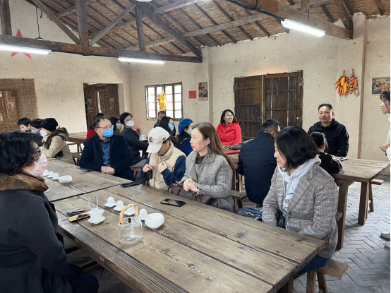 从充满现代感的纪念馆里走出来,漫步在知青农场的砖瓦小路上,很快,大家就看到了一个旧村落,茶艺教学活动就安排在此处。在茶艺老师的带领下,大家一起学习了洗器、温壶、投茶、摇香、闻香、洗茶、冲泡、分茶等技巧,在举壶秀茶艺、低头品茶甘中,缓缓放下尘世的喧嚣,沉浸在安谧、愉悦的氛围中。