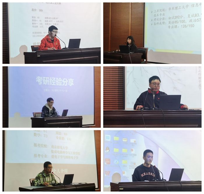 会上,已经成功考取研究生的六名同学作考研经验分享,他们结合自身考研经历,从考研动机、学习方法、择校经验、资料准备、考研时间安排、计划制定等方面,与同学们分享考研经验。