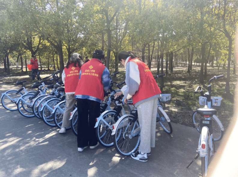 4月25日,阳光明媚,环境科学与工程学院组织学生在校内将散乱摆放的共享单车整理到位,摆放有序。其中有部分单车历经风吹雨打,不同程度出现污损,为了给大家创造干净整洁的环境,学院同学同时对单车进行清理,令它们焕然一新。